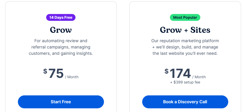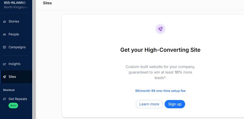 Grow + Sites Plan ($174/month + $399 setup fee): This option includes a fully optimized custom-built website in addition to the Grow plan. The site is designed to convert 10% more leads, boost your Google ranking through SEO, and capture more leads with personalized lead forms.